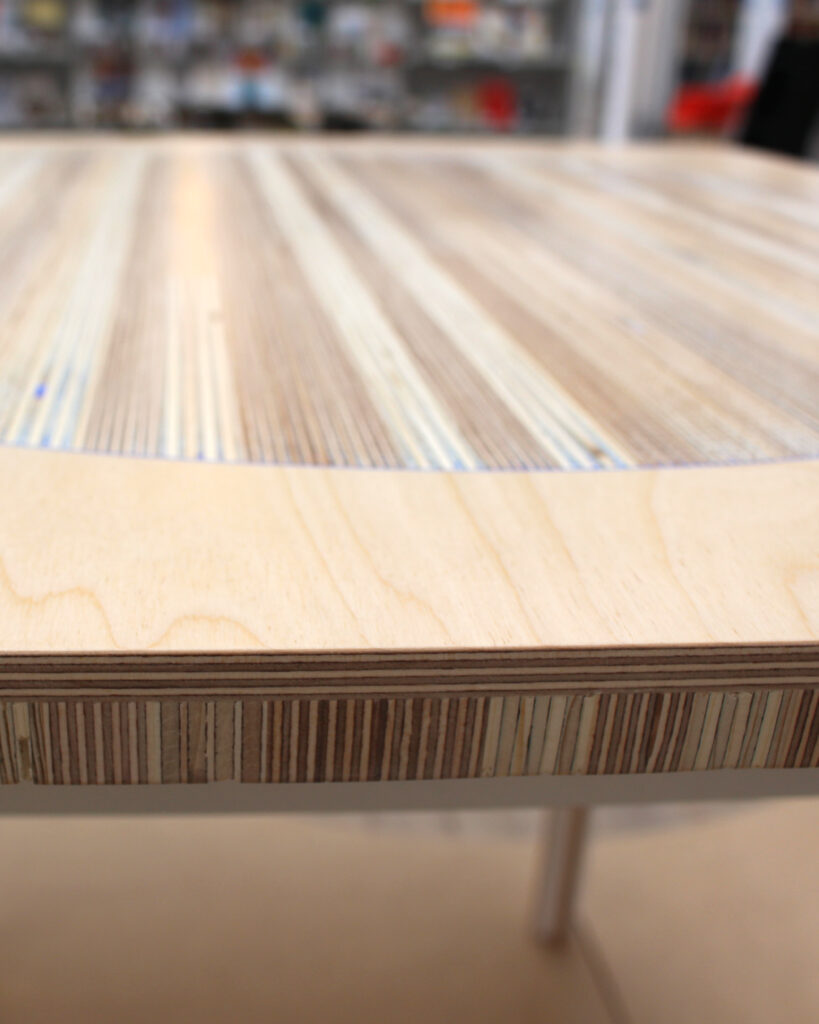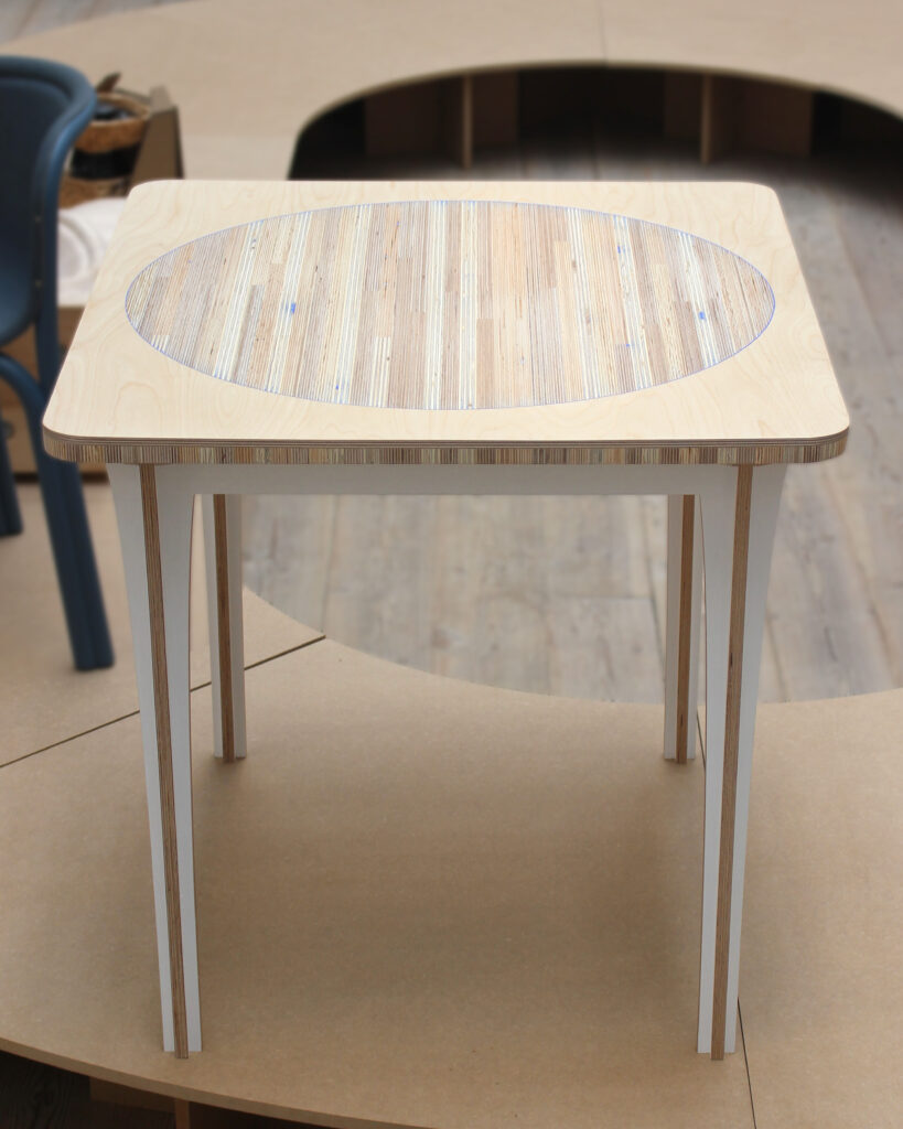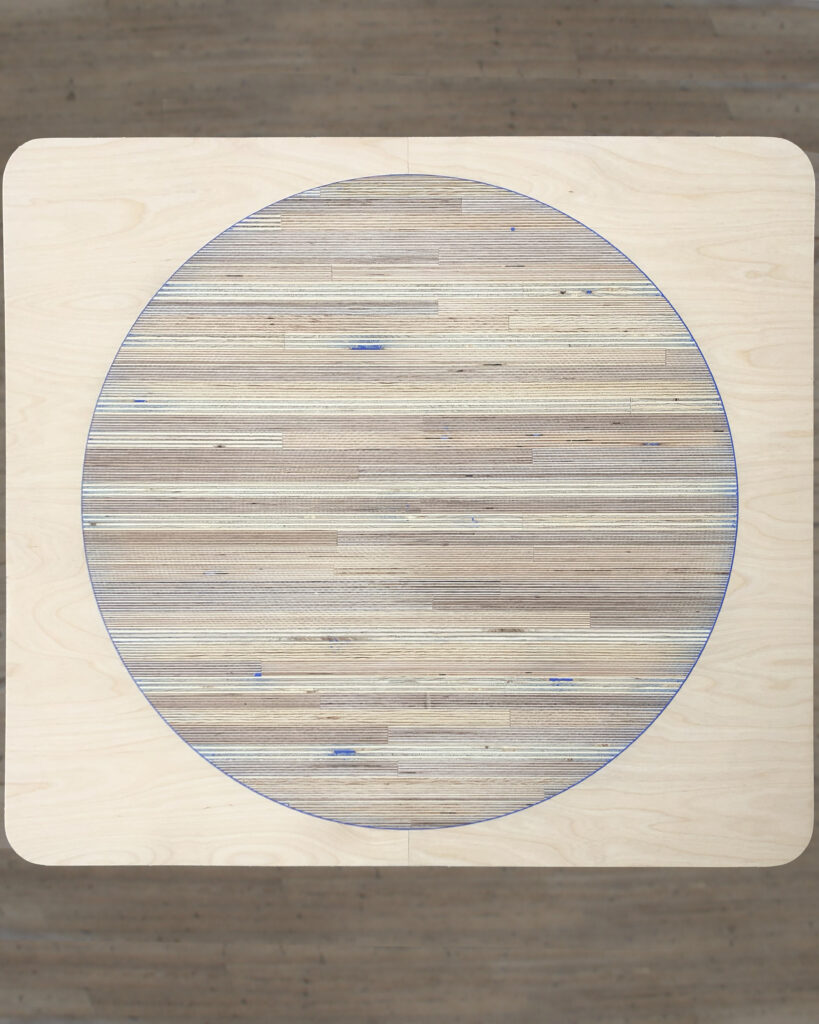 The table is made from plywood scraps that have been glued together into a solid surface. The top has then been milled out around the center and accompanied by another plywood scrap arranged perpendicular to the striped pattern resulting in this circular framing of the stripped material.