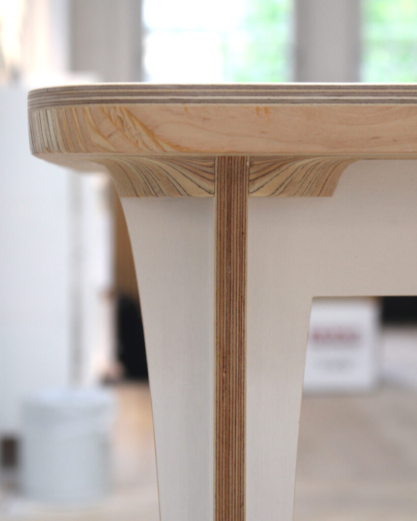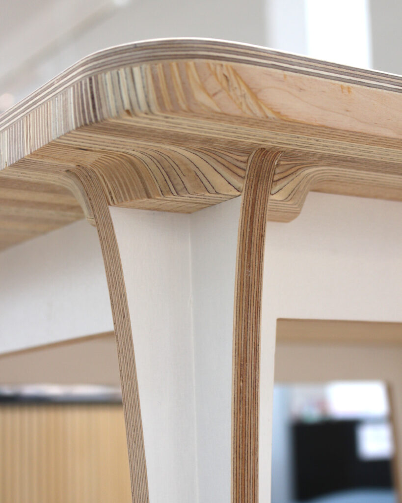 The underside is likewise CNC-milled to fit the plywood legs of the table with rounded details where the legs meets the body.